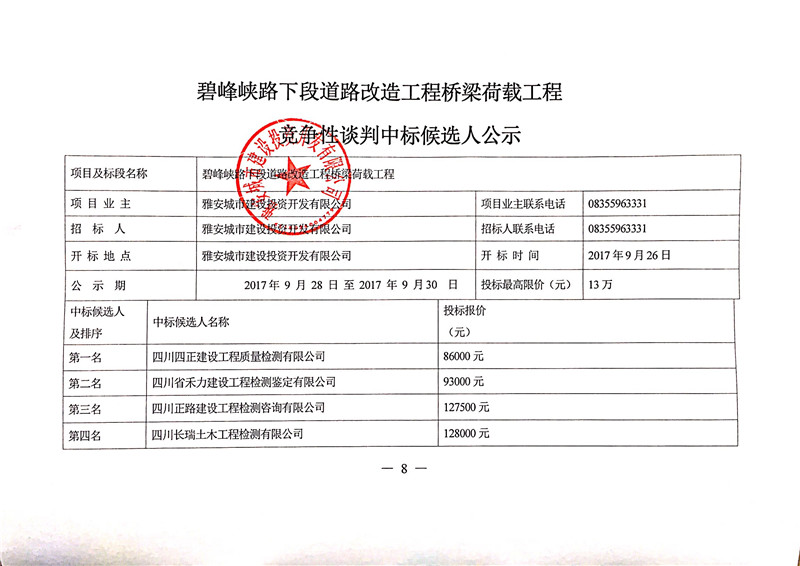 碧峰峽路下段道路改造工程橋梁荷載工程競爭性談判中標(biāo)候選人公示