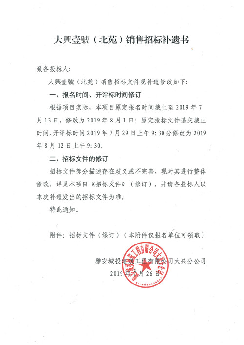 大興壹號(hào)(北苑)銷售招標(biāo)補(bǔ)遺書