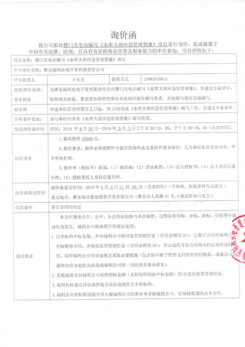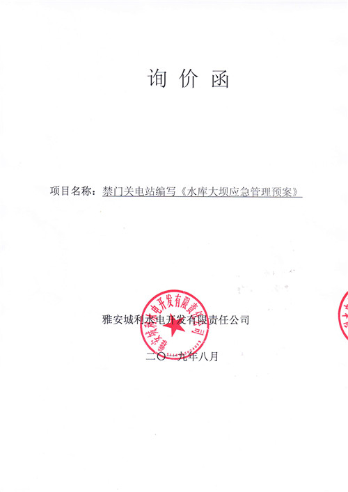 雅安城利水電開(kāi)發(fā)有限責(zé)任公司禁門(mén)關(guān)電站編寫(xiě)《水庫(kù)大壩應(yīng)急管理預(yù)案》競(jìng)爭(zhēng)性談判公告