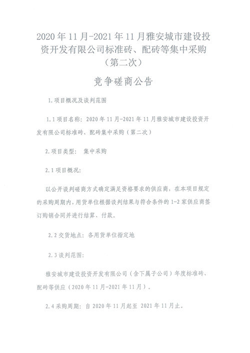 2020年11月-2021年11月雅安城市建設(shè)投資開(kāi)發(fā)有限公司標(biāo)準(zhǔn)磚、配磚等集中采購(gòu)(第二次)競(jìng)爭(zhēng)磋商公告