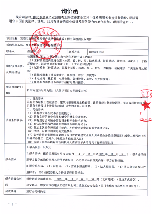 雅安市康養(yǎng)產(chǎn)業(yè)園銀杏北路道路建設(shè)工程主體檢測(cè)服務(wù)詢(xún)價(jià)函
