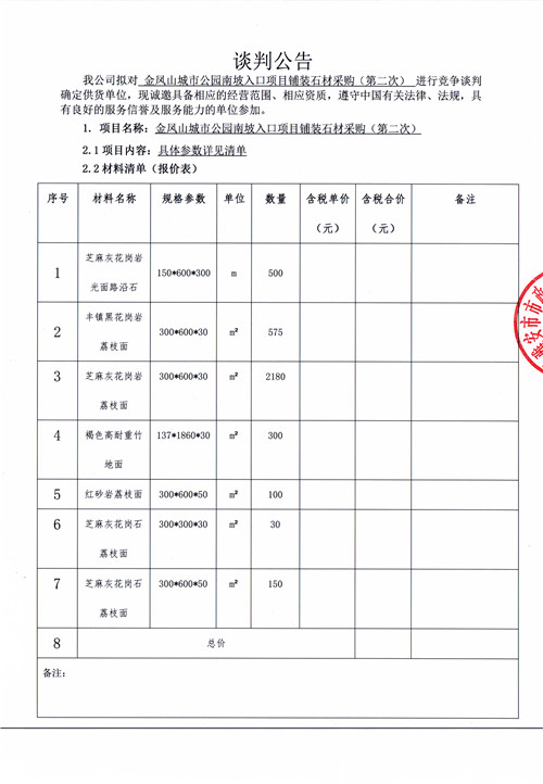 金鳳山城市公園南坡入口項目鋪裝石材采購(第二次)競爭性談判公告