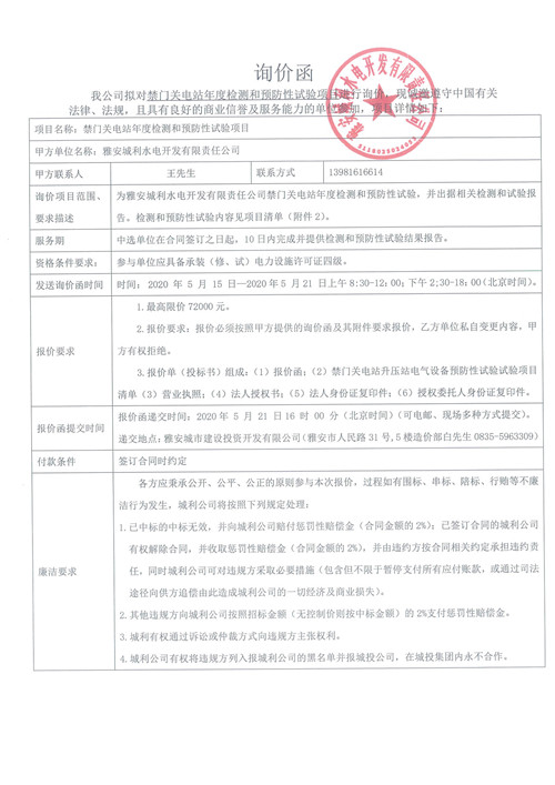 城利水電公司禁門關電站年度檢測和預防性試驗項目詢價函