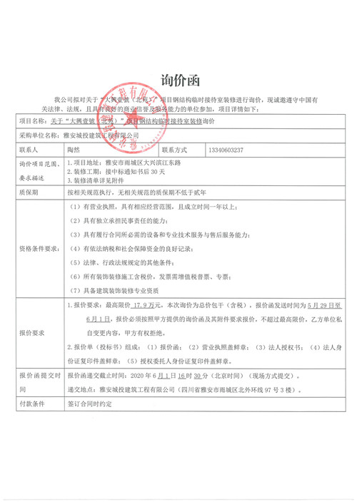 城投建工公司“大興壹號(hào)(北苑)”項(xiàng)目鋼結(jié)構(gòu) 臨時(shí)接待室裝修的詢價(jià)函