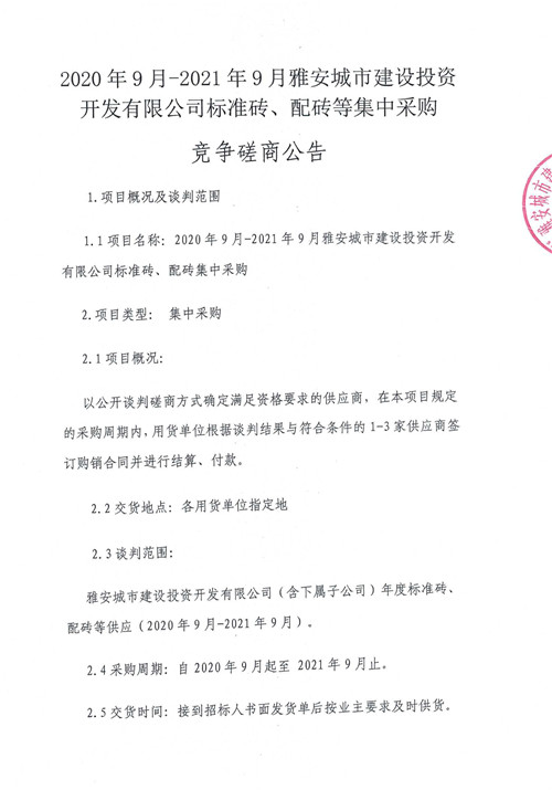 2020年9月-2021年9月雅安城市建設(shè)投資開(kāi)發(fā)有限公司標(biāo)準(zhǔn)磚、配磚等集中采購(gòu)競(jìng)爭(zhēng)磋商公告