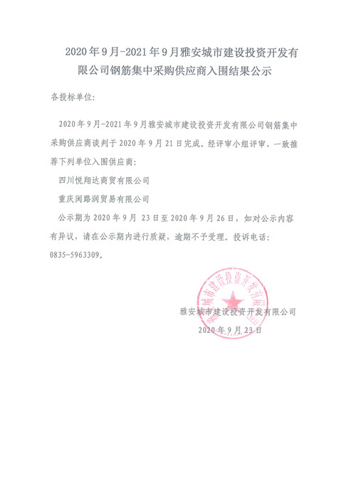 2020年9月-2021年9月雅安城市建設(shè)投資開發(fā)有限公司鋼筋集中采購供應商入圍結(jié)果公示