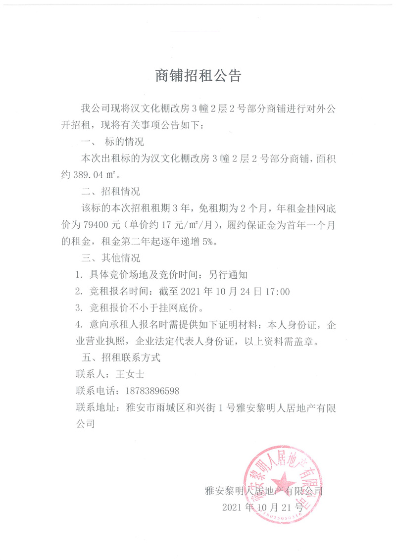 漢文化安置房3幢2層2號部分商鋪招租公告