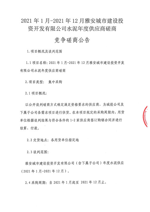 2021年1月-2021年12月雅安城市建設(shè)投資開發(fā)有限公司水泥年度供應(yīng)商磋商競(jìng)爭(zhēng)磋商公告