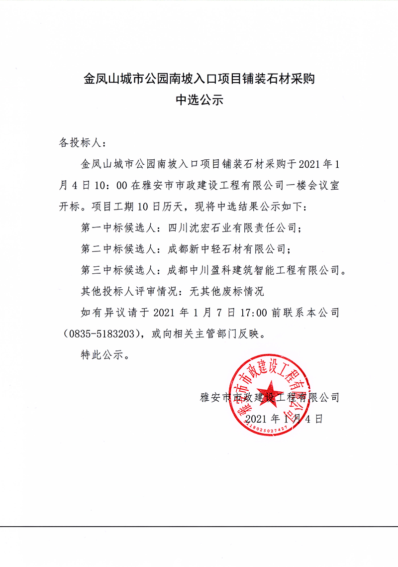 金鳳山城市公園南坡入口項目鋪裝石材采購中選公示