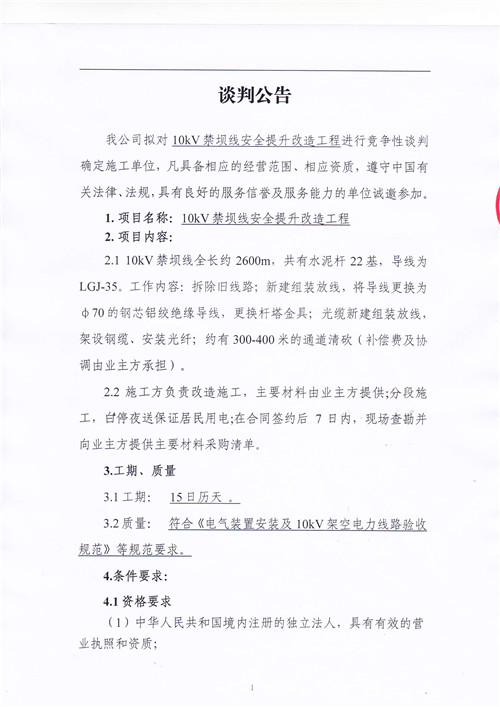 城利水電公司10kV禁壩線安全提升改造工程競(jìng)爭(zhēng)性談判公告