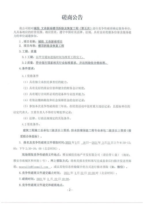 城投.文曲新座樓頂拆除及恢復(fù)工程競(jìng)爭(zhēng)性磋商公告(第五次)