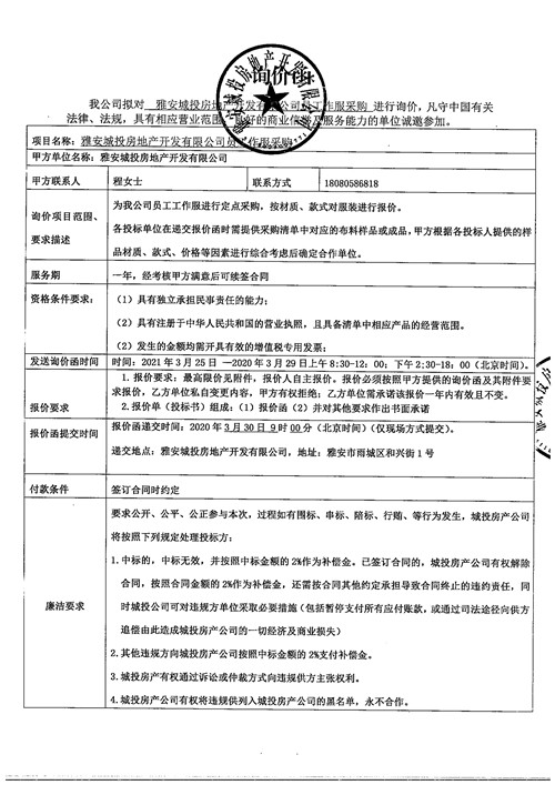 城投地產(chǎn)公司工作服采購詢價函