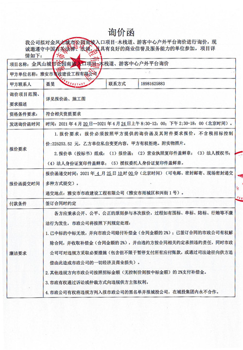 金鳳山城市公園南坡入口項目-木棧道、游客中心戶外平臺詢價函