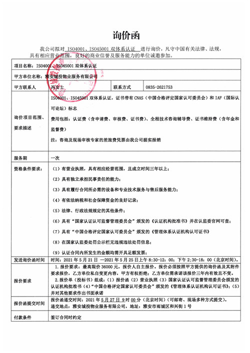 城投物業(yè)IS04001、IS045001雙體系認(rèn)證詢價(jià)函