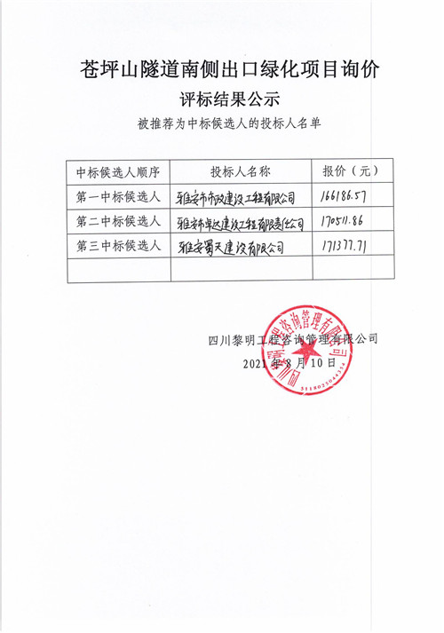 黎明咨詢公司蒼坪山隧道南側(cè)出口綠化項目詢價評標(biāo)結(jié)果公示