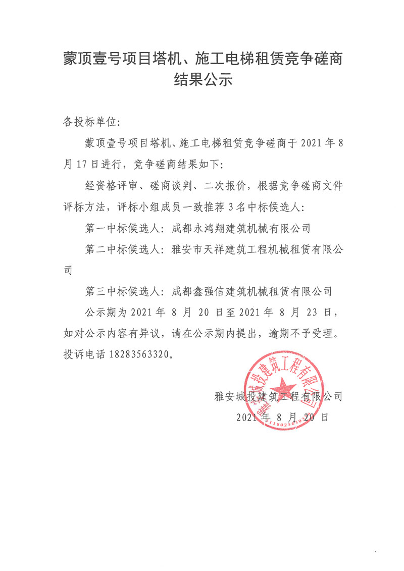 城投建工公司蒙頂壹號項(xiàng)目塔機(jī)、施工電梯租賃競爭磋商結(jié)果公告