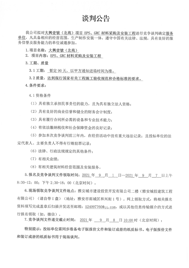 大興壹號(北苑)項(xiàng)目EPS、GRC材料采購及安裝工程競爭談判公告