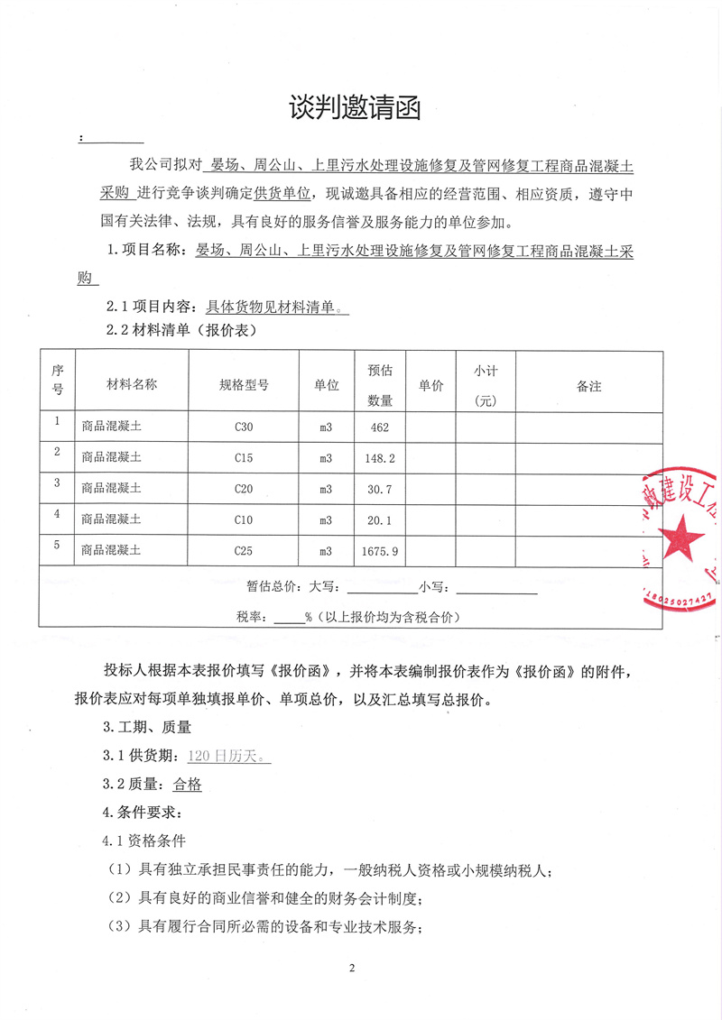 晏場、周公山、上里污水處理設(shè)施修復(fù)及管網(wǎng)修復(fù)工程商品混凝土采購競爭性談判公告