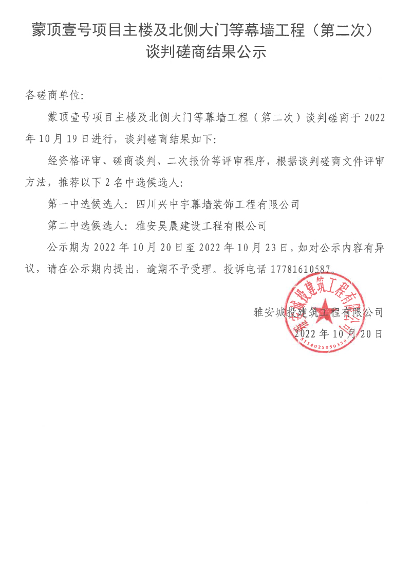 蒙頂壹號項目主樓及北側大門等幕墻工程(第二次)談判磋商結果公示