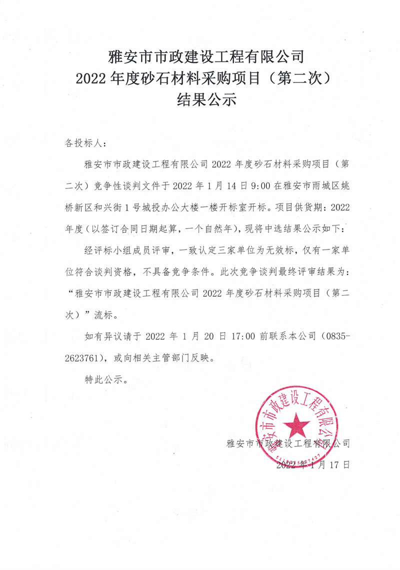 雅安市市政建設(shè)工程有限公司2022年度砂石材料采購項(xiàng)目(第二次)結(jié)果公示