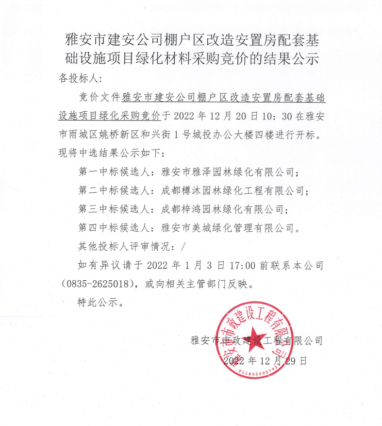 雅安市建安公司棚戶區(qū)改造安置房配套基礎(chǔ)設(shè)施項(xiàng)目綠化材料采購競價(jià)結(jié)果公示