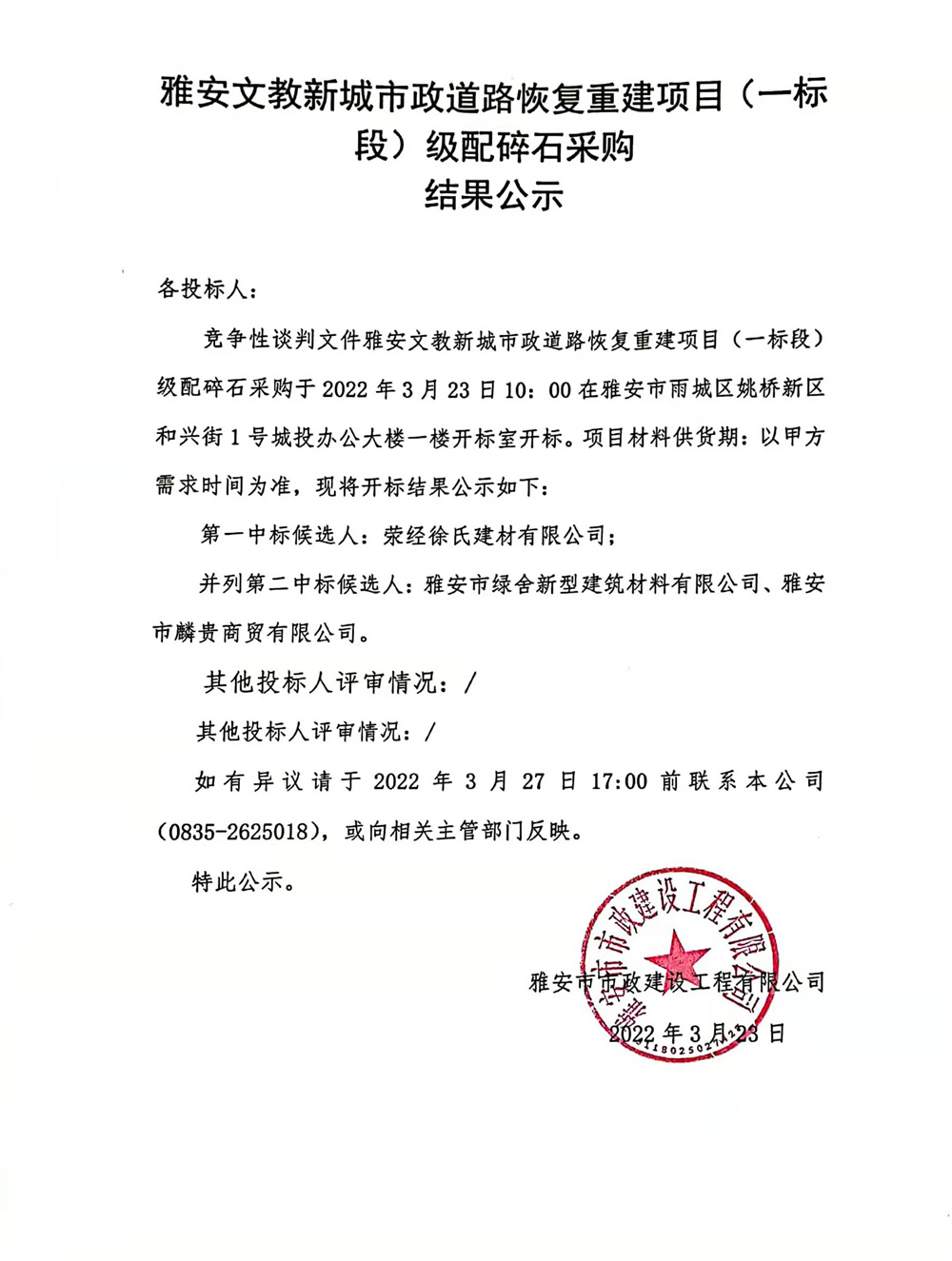 雅安文教新城市政道路恢復重建項目(一標段)級配碎石采購結果公示