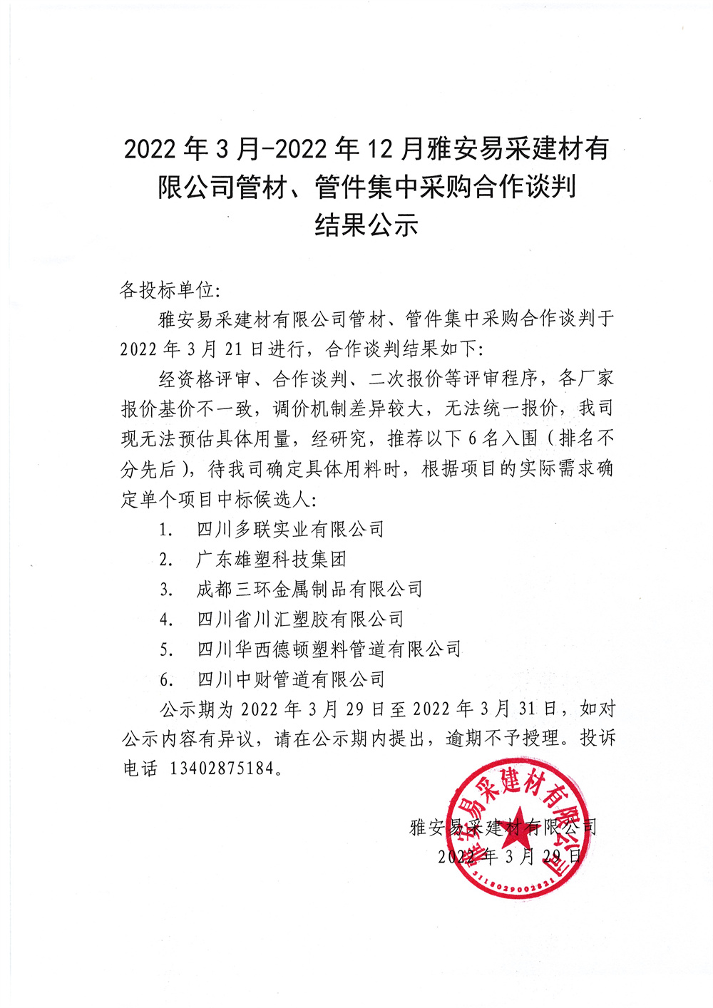 2022年3月-2022年12月雅安易采建材有限公司管材、管件集中采購合作談判結(jié)果公示