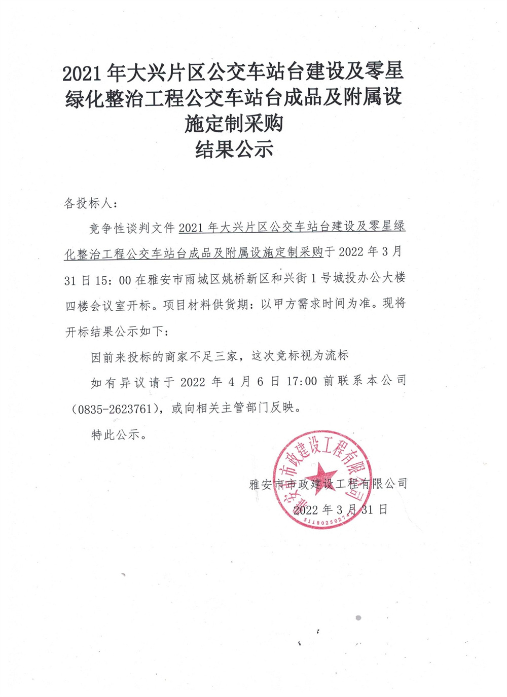 2021年大興片區(qū)公交站臺(tái)建設(shè)及零星綠地整治工程公交站臺(tái)成品及附屬設(shè)施定制采購結(jié)果公示