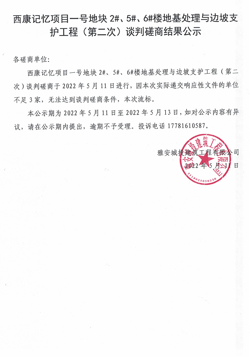 西康記憶項(xiàng)目一號地塊2#、5#、6#樓地基處理與邊坡支護(hù)工程(第二次)談判磋商結(jié)果公示