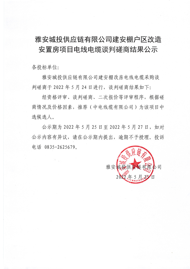 雅安城投供應(yīng)鏈有限公司建安公司棚戶區(qū)改造安置房項(xiàng)目電線電纜談判磋商結(jié)果公示