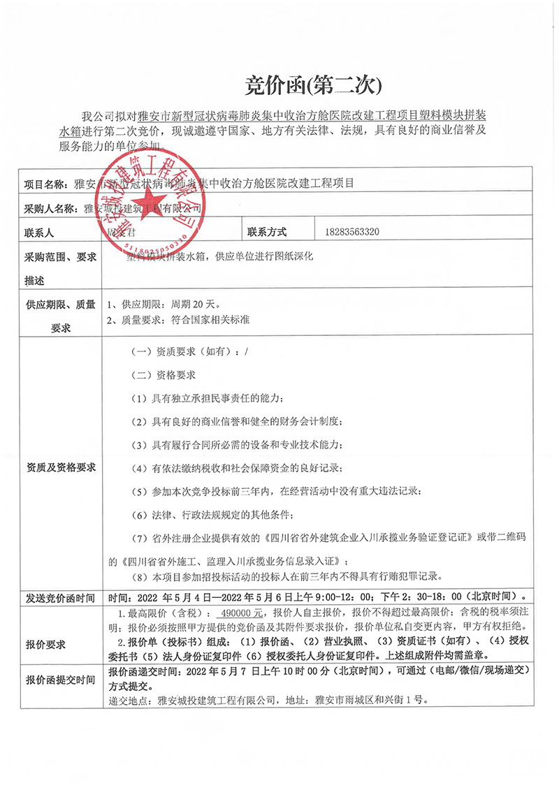 雅安市新型冠狀病毒肺炎集中收治方艙醫(yī)院改建工程項目塑料模塊拼裝水箱競價函(第二次)