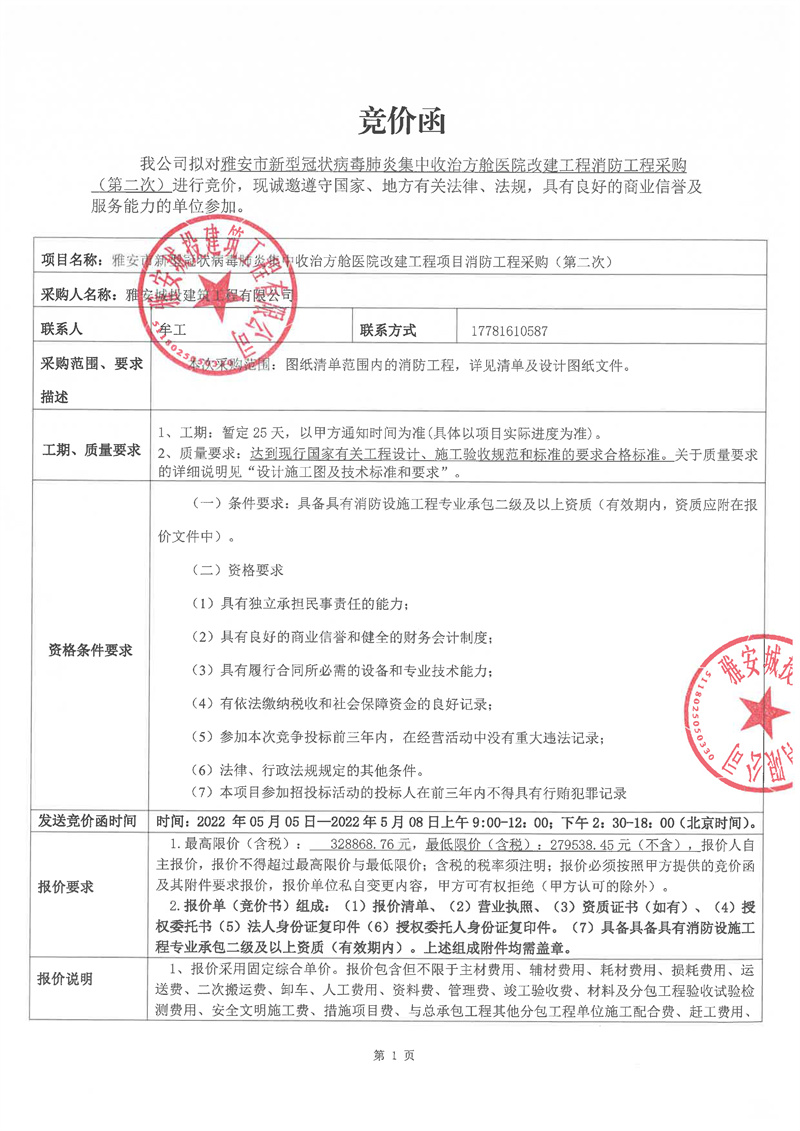 雅安市新型冠狀病毒肺炎集中收治方艙醫(yī)院改建工程項目消防工程競價公告(第二次)