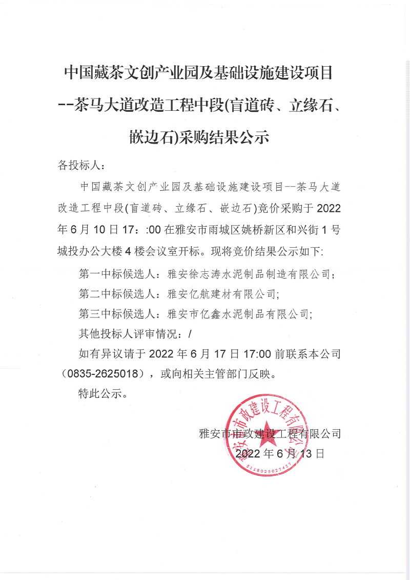 中國藏茶文創(chuàng)產業(yè)園及基礎設施建設項 茶馬大道改造工程中段盲道磚、混凝土嵌邊石采購結果公示