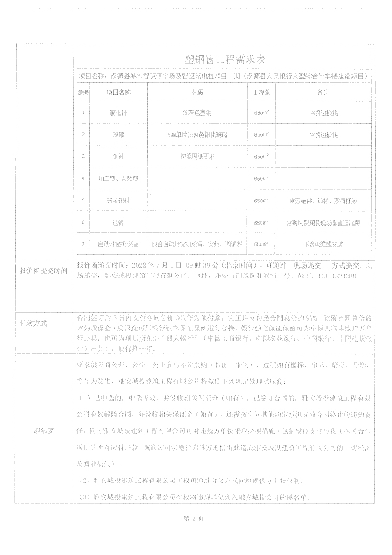 漢源縣城市智慧停車場及智慧充電樁項目一期漢源縣城人民銀行大型綜合樓停車樓建設項目塑鋼窗采購競價公告