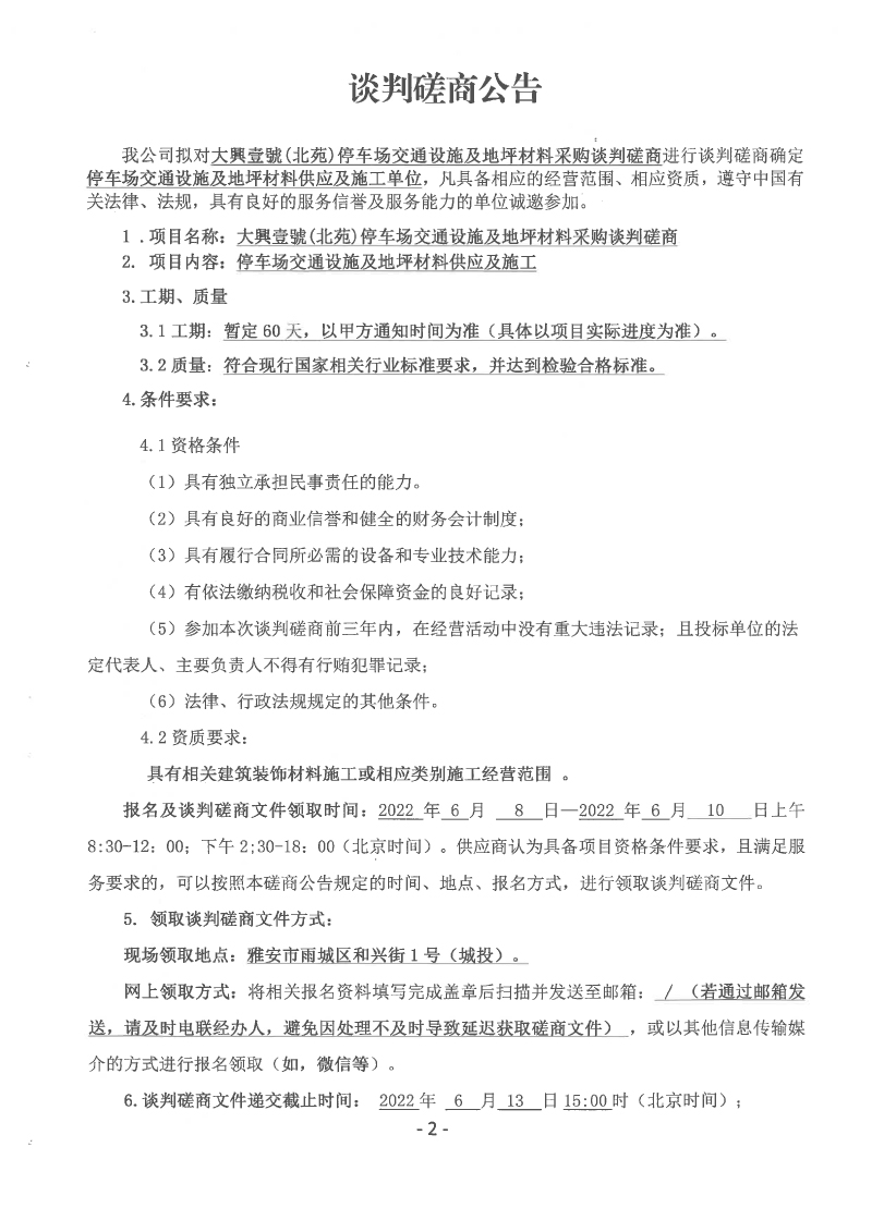 大興壹號(hào)(北苑)停車場(chǎng)交通設(shè)施及地坪材料采購(gòu)談判磋商公告