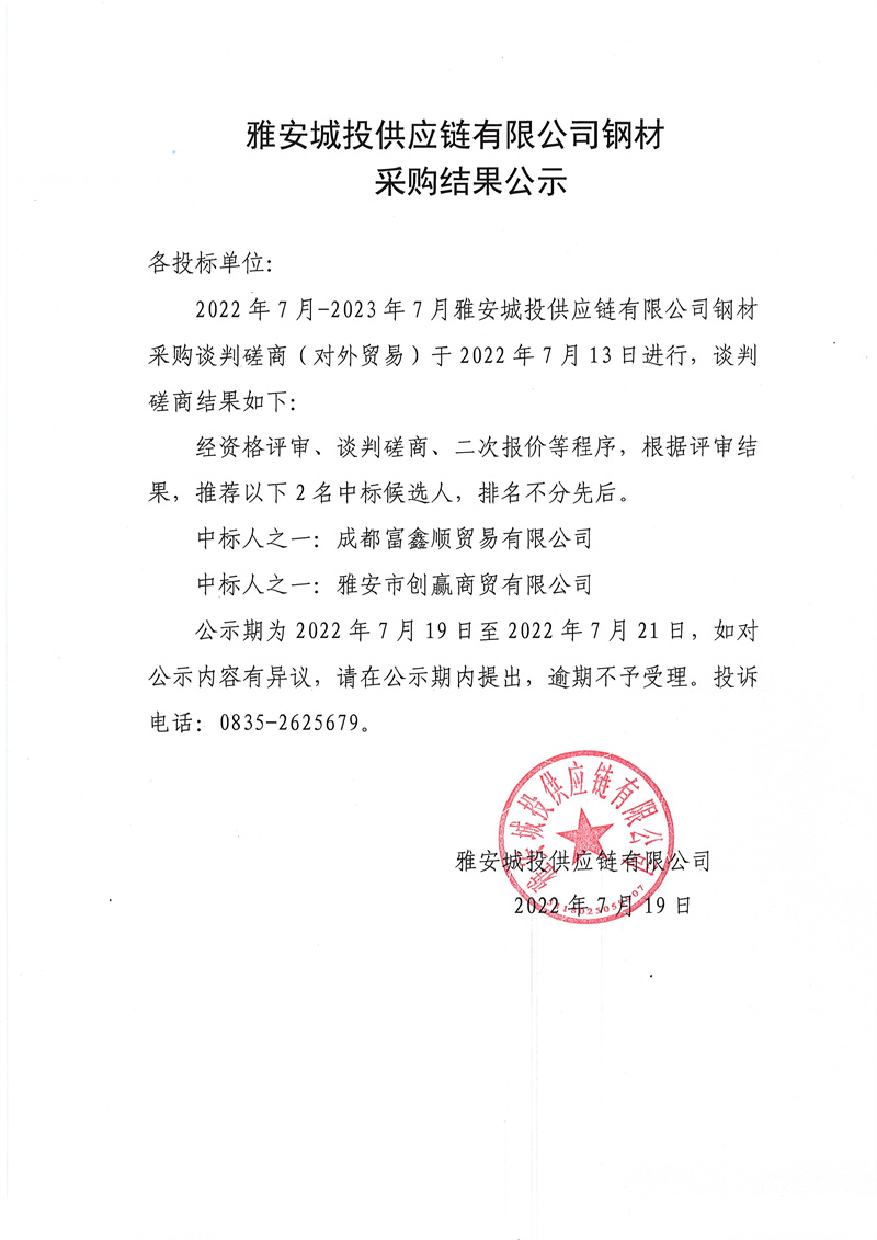 雅安城投供應鏈有限公司鋼材采購結果公示