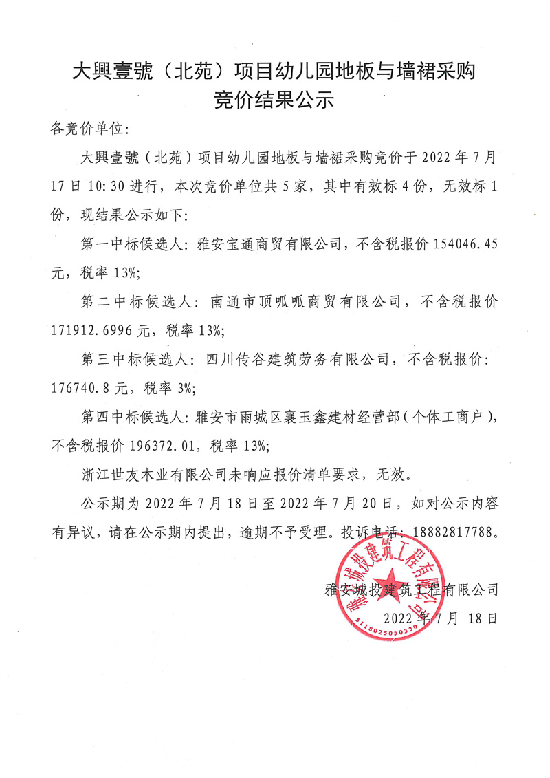 大興壹號(北苑)項(xiàng)目幼兒園地板與墻裙競價結(jié)果公示