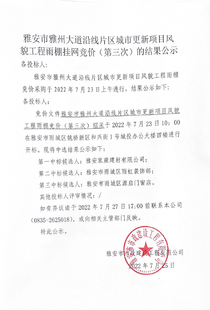 雅安市雅州大道沿線片區(qū)城市更新項目風貌工程雨棚競價(第三次)的結(jié)果公示