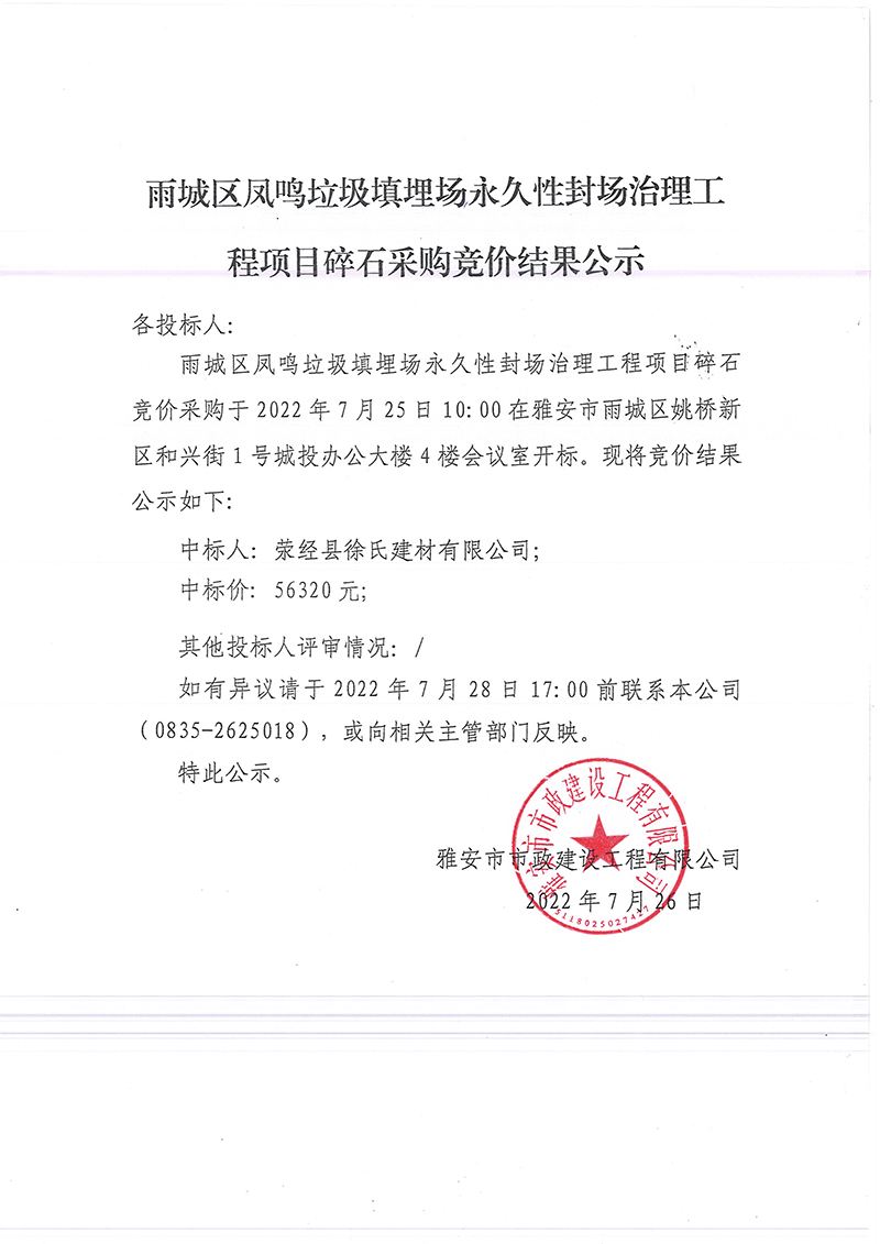 雨城區(qū)鳳鳴垃圾填埋場永久性封場治理工程項目碎石采購競價結(jié)果公示