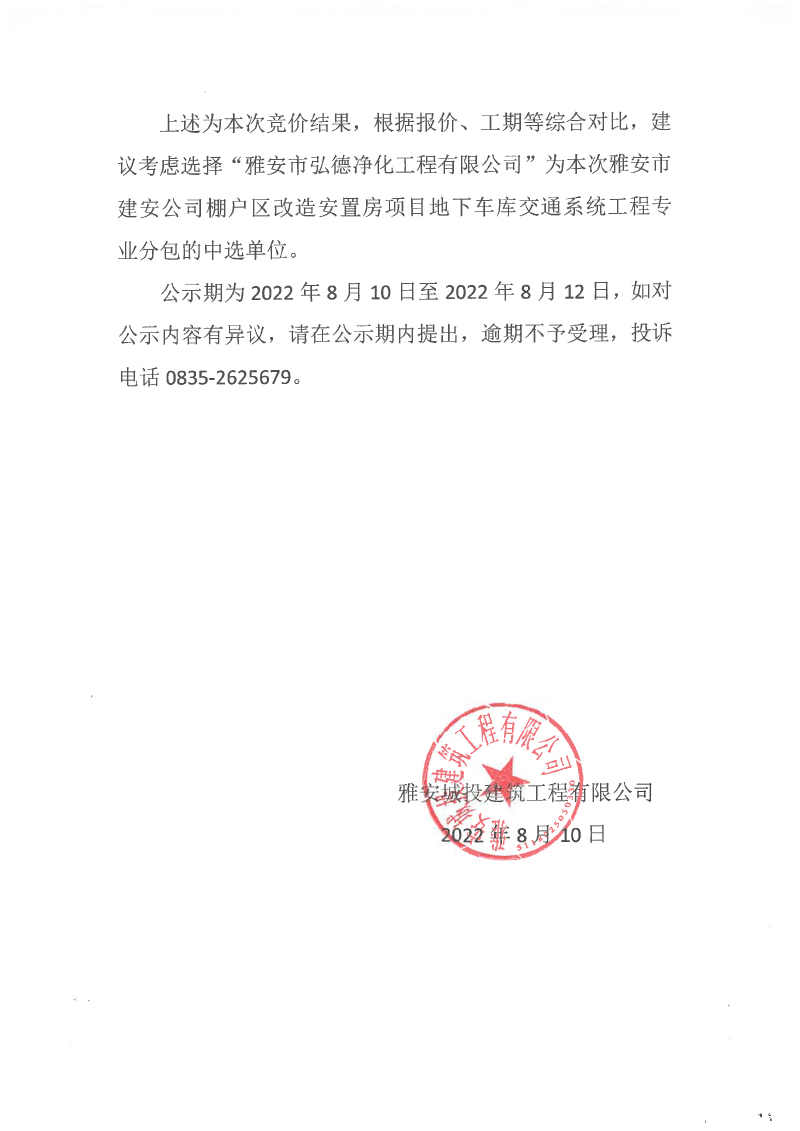 雅安市建安公司棚戶區(qū)改造安置房項(xiàng)目地下車庫交通系統(tǒng)工程專業(yè)分包競價(jià)結(jié)果公示
