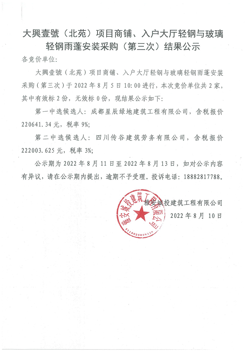 大興壹號(hào)(北苑)項(xiàng)目商鋪、入戶大廳輕鋼與玻璃輕鋼雨蓬安裝采購(gòu)(第三次)結(jié)果公示