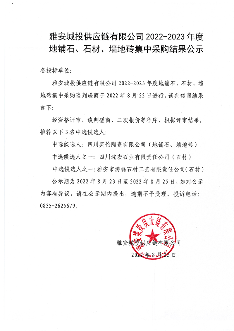 雅安城投供應(yīng)鏈有限公司2022-2023年度地鋪石、石材、墻地磚集中采購(gòu)結(jié)果公示