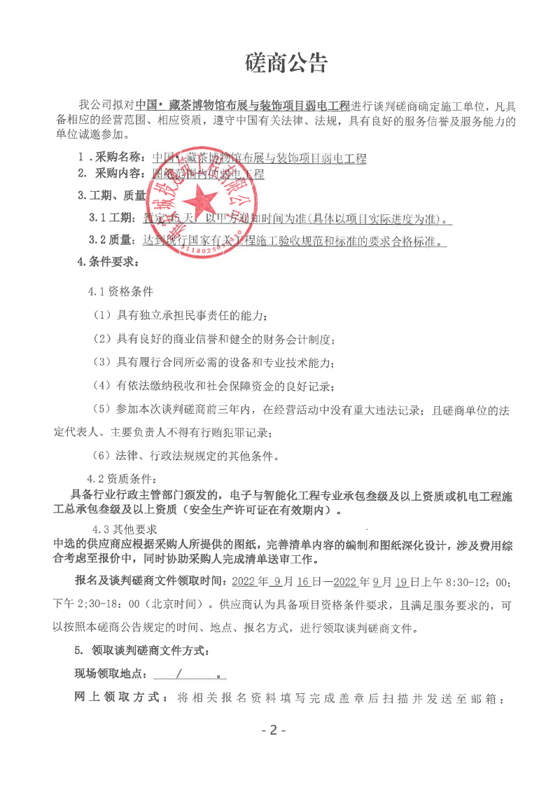 中國• 藏茶博物館布展與裝飾項(xiàng)目弱電工程談判磋商公告
