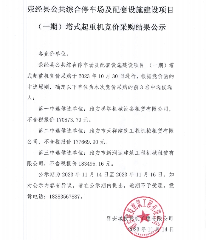 滎經(jīng)縣公共綜合停車場及配套設(shè)施建設(shè)項目(一期)塔式起重機(jī)競價采購結(jié)果公示