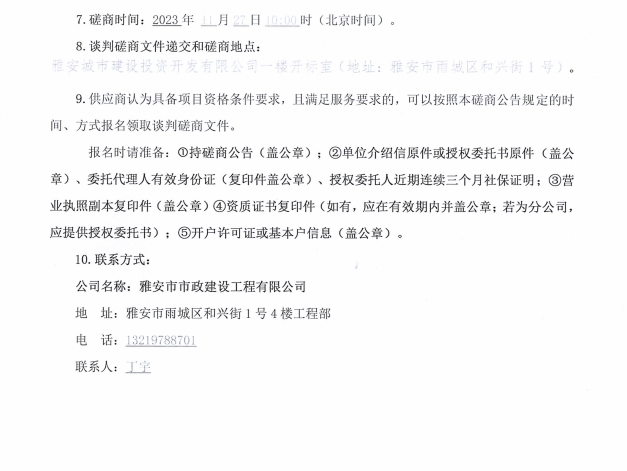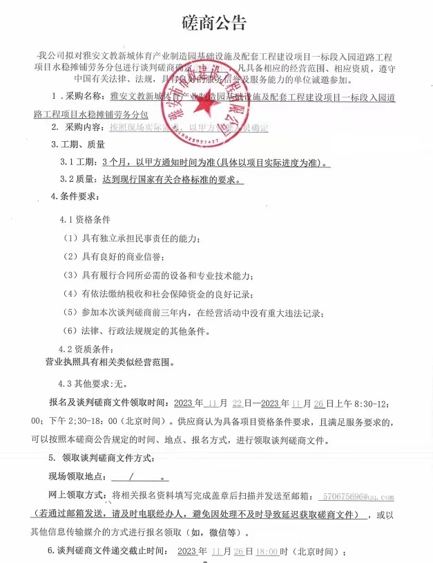 雅安文教新城體育產(chǎn)業(yè)制造園基礎設施及配套工程建設項目一標段入園道路工程項目水穩(wěn)攤鋪勞務分包磋商公告