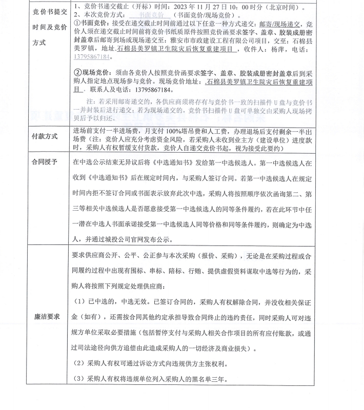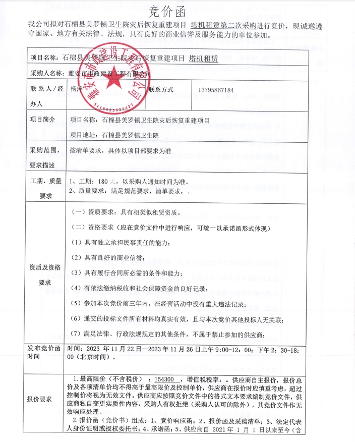 石棉縣美羅鎮(zhèn)衛(wèi)生院災(zāi)后恢復(fù)重建項目塔機租賃(第二次)采購競價公告