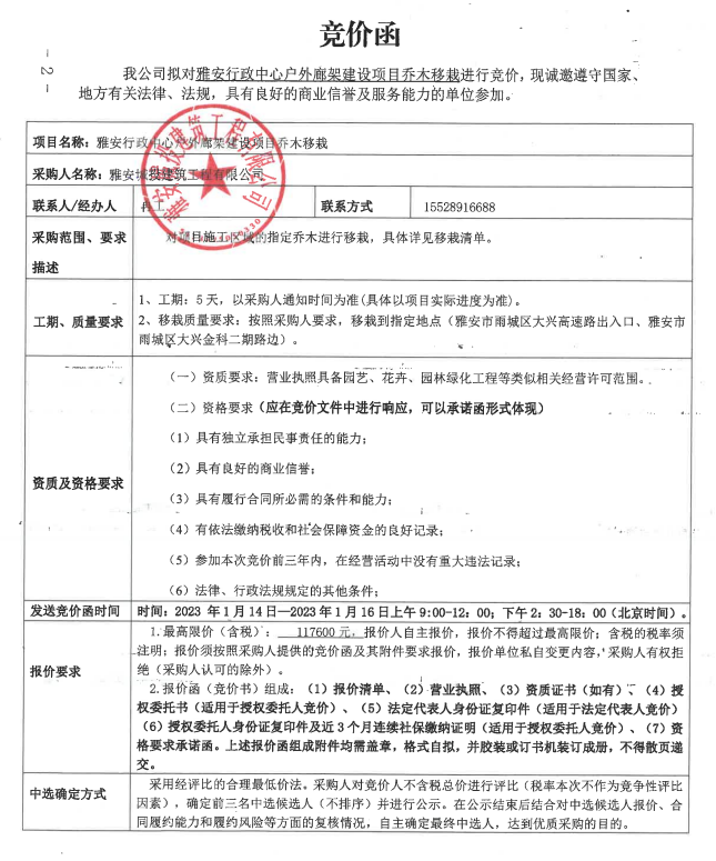 雅安行政中心戶外廊架建設(shè)項(xiàng)目喬木移栽競價(jià)公告
