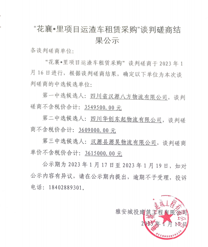花襄·里項(xiàng)目運(yùn)渣車租賃采購(gòu)談判磋商結(jié)果公示