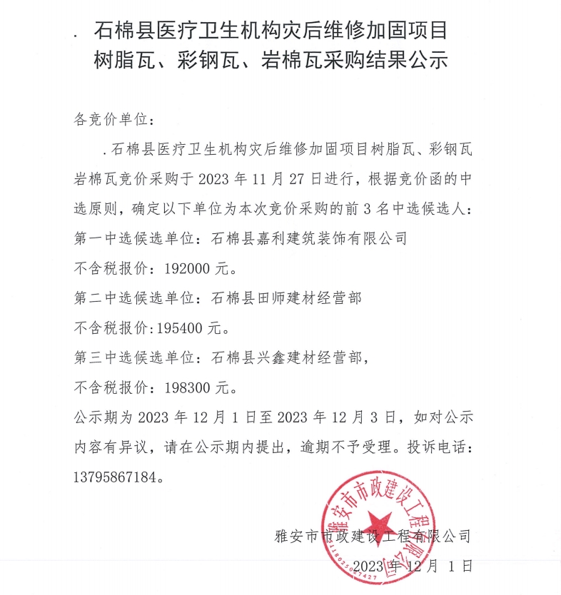 石棉縣醫(yī)療衛(wèi)生機(jī)構(gòu)災(zāi)后維修加固項目樹脂瓦、彩鋼瓦、巖棉瓦采購結(jié)果公示