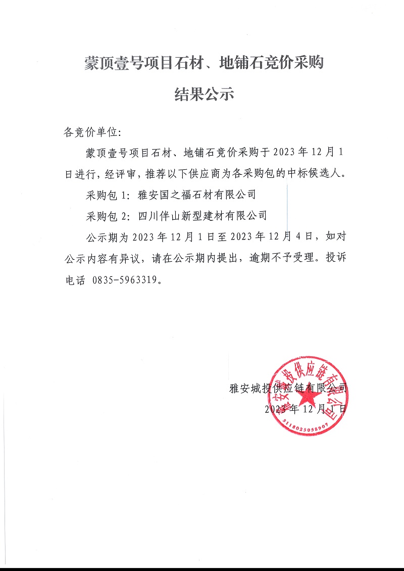 蒙頂壹號(hào)項(xiàng)目石材、地鋪石競(jìng)價(jià)采購結(jié)果公示